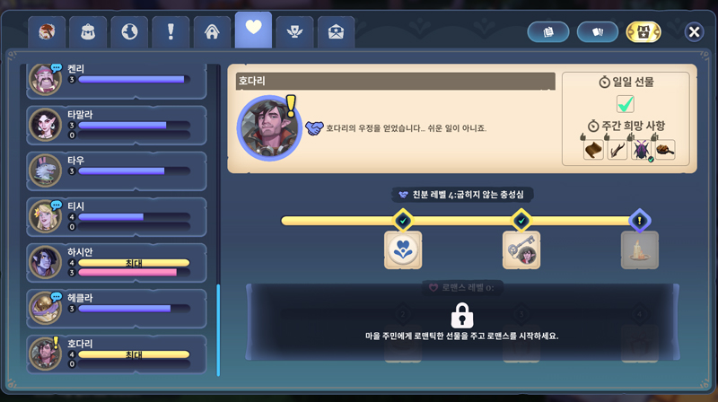 그리고 친분4레벨 코앞인 켄리에게 줄 감자수프를 만들어서 찾아갔다. 이래저래 공작부인에게 세금을 내야 하는데 나에게 각종 농산물을 가져와달라는 퀘스트가 발생했다. 당근, 양파, 토마토, 감자, 밀 이건데 이정도면 다 껌이지 뭐 ㅋㅋㅋㅋㅋ