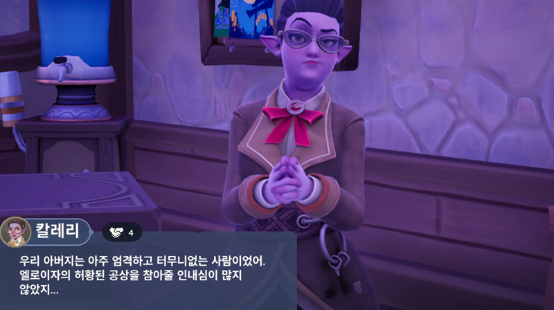 재료를 엘로이자에게 전해주고 엘로이자는 그 재료로 일기장을 만들어 대신 칼레리에게 전해달라고 해서 전해주었다. 칼레리는 물약을 실패했다며 스스로를 책망하고 있었는데 엘로이자가 만든 일기장을 전해주니 약간 집안사정을 알려줬다. 알고봤더니 어릴적에 두사람의 일기장은 아버지한테서 찢겨지고 두사람은 엄청 혼났다고 한다. 어쨌든 일기장을 받아들고 나에게 준건 필사본인데 뭔 필사본인지는 모르겠네;;